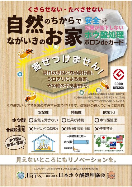 ホウ酸は、シロアリやゴキブリにとっては有害ですが、人間やイヌ・ネコなどペットにとっては無害で安全です。また、合成殺虫剤は数年で効果が無くなりますが、ホウ酸は水で流したりしない限り効果が持続します。