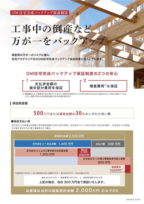 ご契約から安心して家づくりを楽しんで頂けるよう、OM住宅完成バックアップ保証制度に加入いたします。