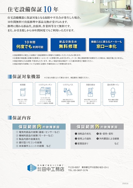 しかし、築10年を超える頃には、家電製品の買い替え・内外装のメンテナンス・お子様の学費…など、様々な出費が想定されます。こんな時期の突然の不具合発生時にも、費用負担なく修理させていただきます。
