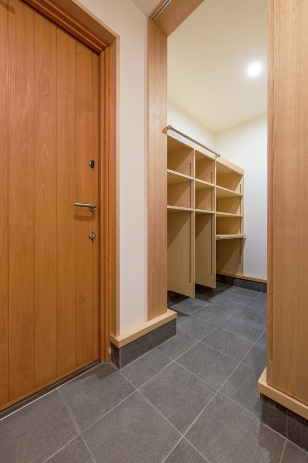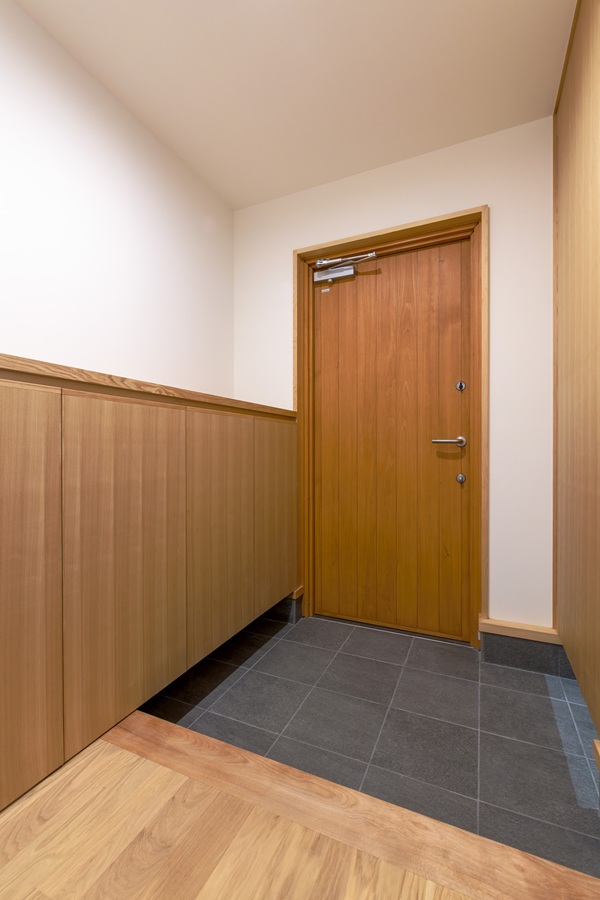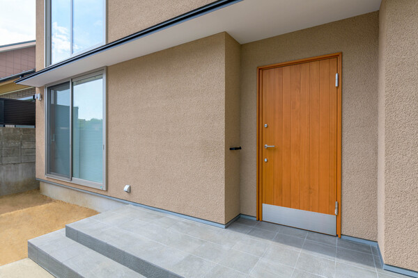 夏の日射を遮る庇は玄関ポーチとつながる(玄関ドア:ユダ木工超断熱ドア)