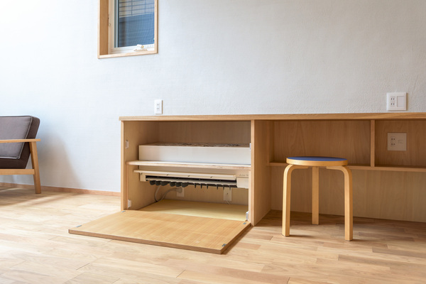 小屋裏への階段開口部(冬の暖房時は効きを良くするため跳ね上げ式の蓋を閉める)