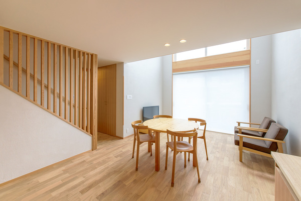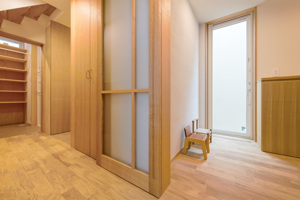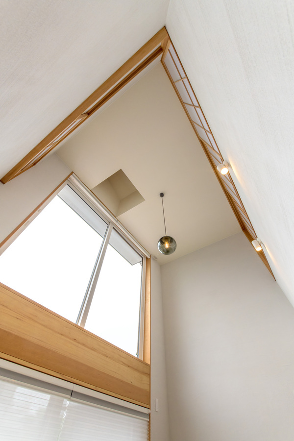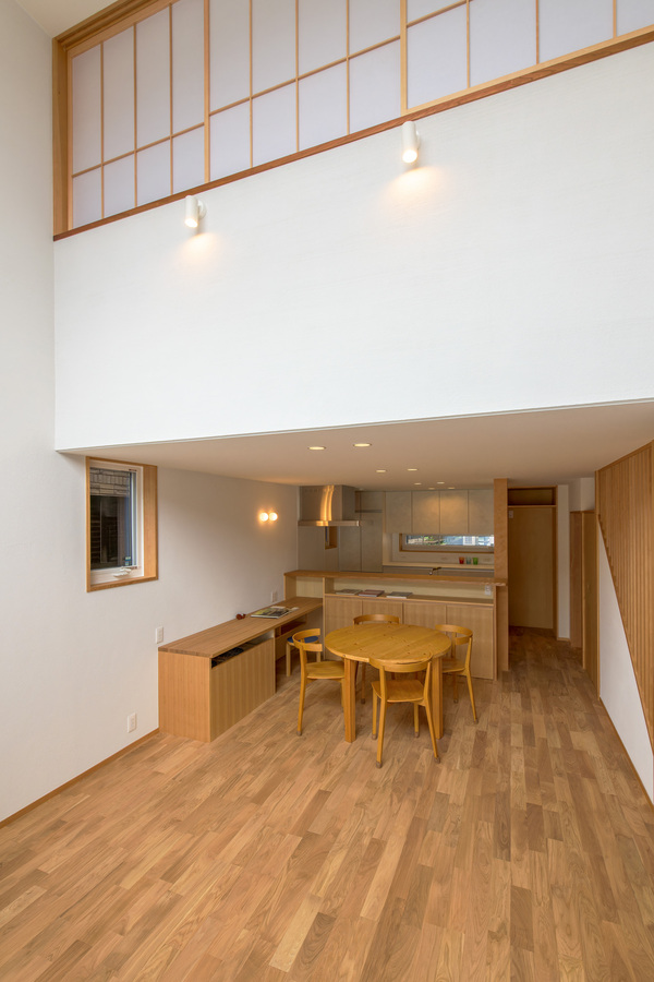 吹き抜けの上は書斎の障子が見える(床:オーク)