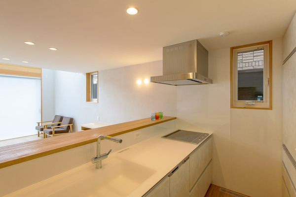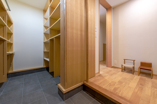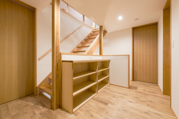 小屋裏へ空気を循環させるためのスリット階段(紀州和歌山のスギ材を使用)/2階ホールの本棚