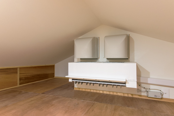 14畳用200Vエアコン(上についた2つの換気扇で、大量の空気を循環させる) 壁の裏側はリビング吹抜けの天井に空いた孔につながる