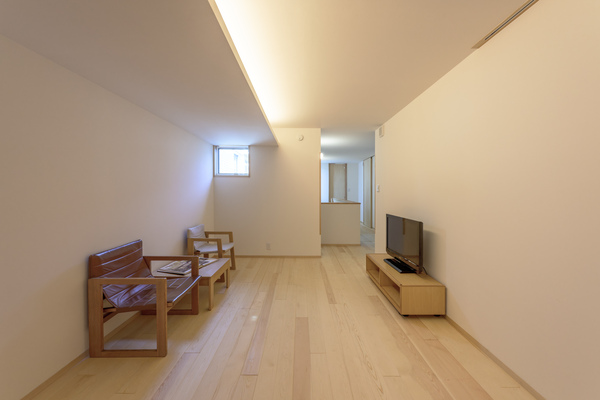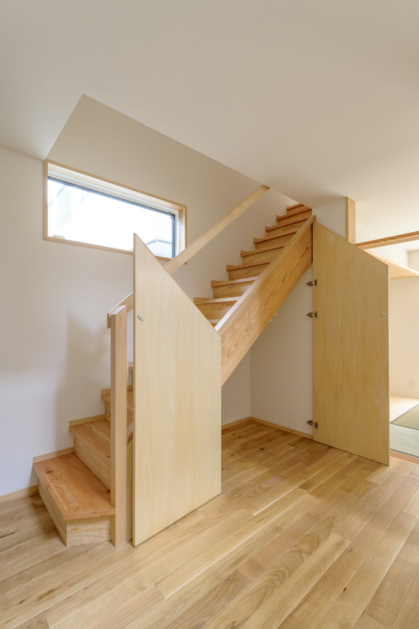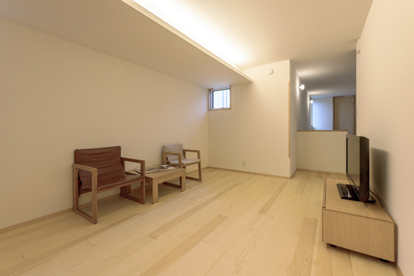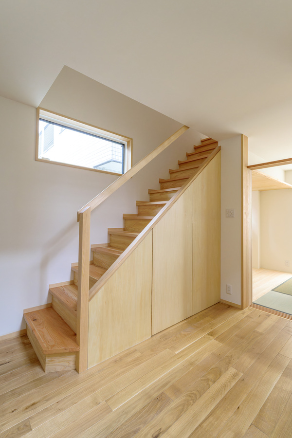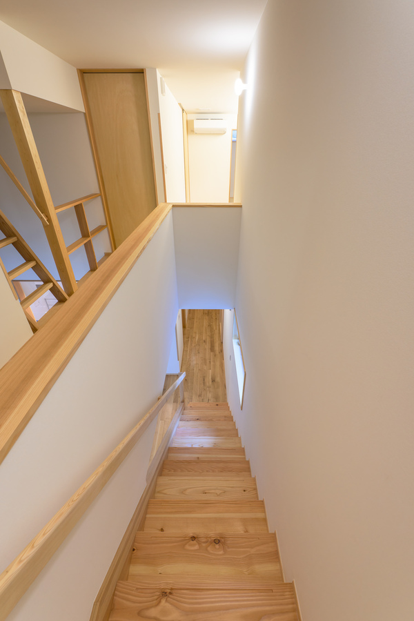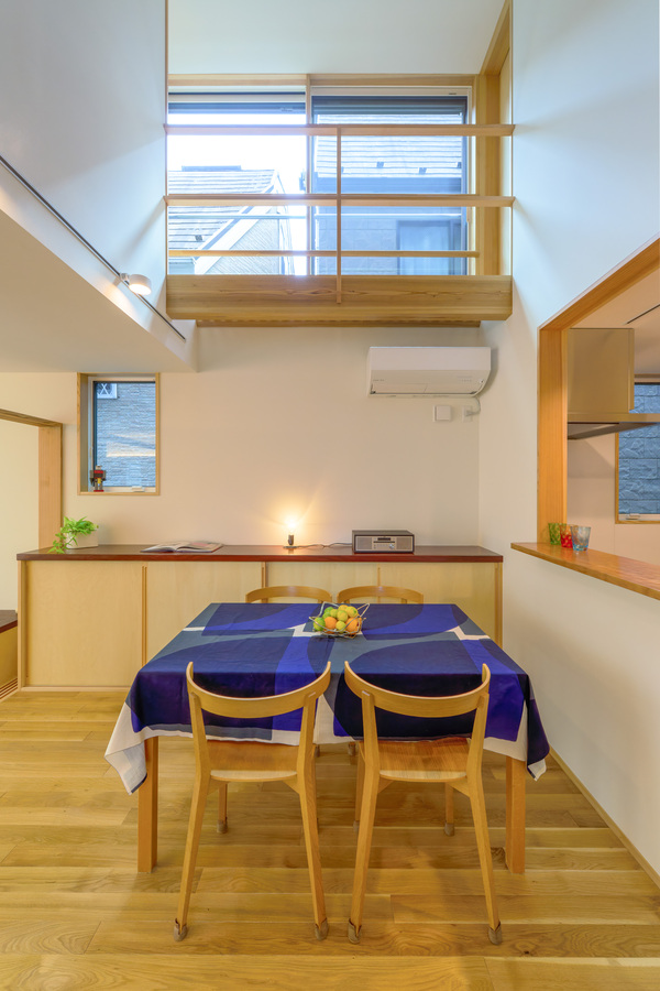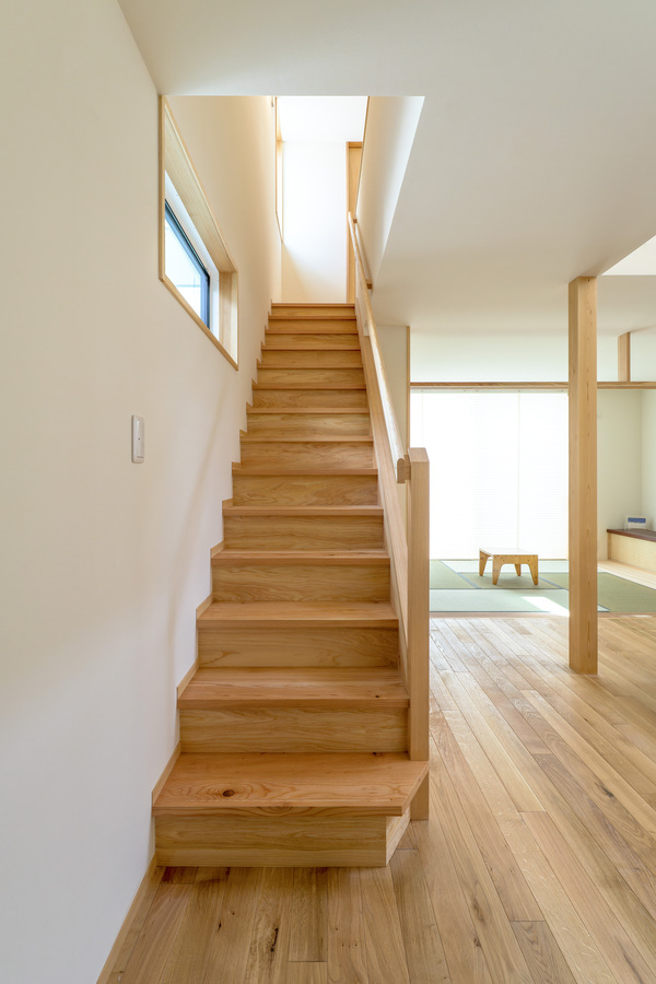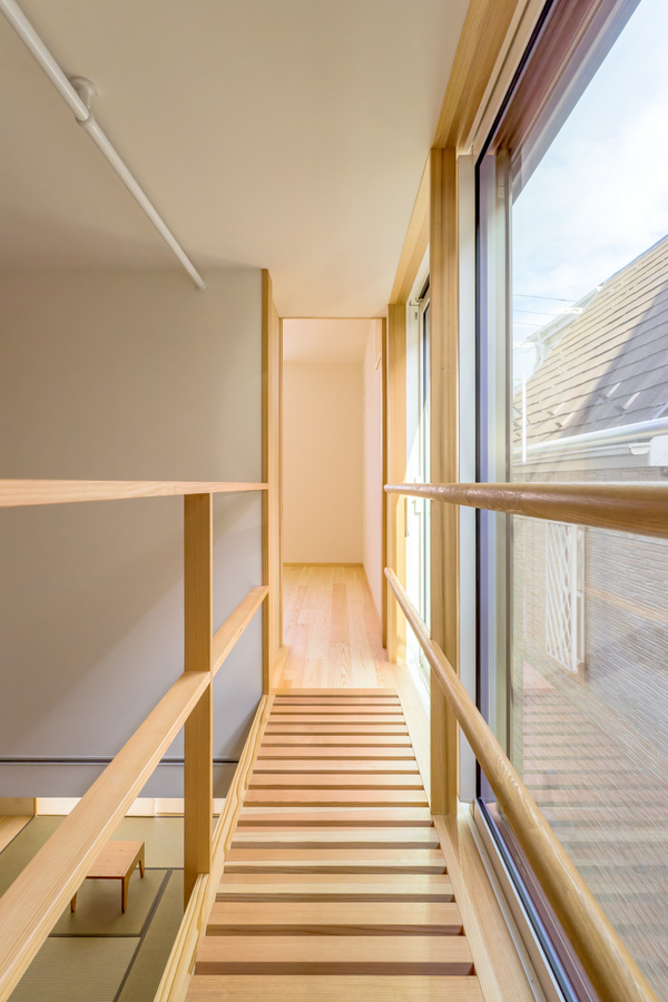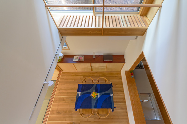 吹き抜け上部、南に面した2階の窓から降り注ぐ光
