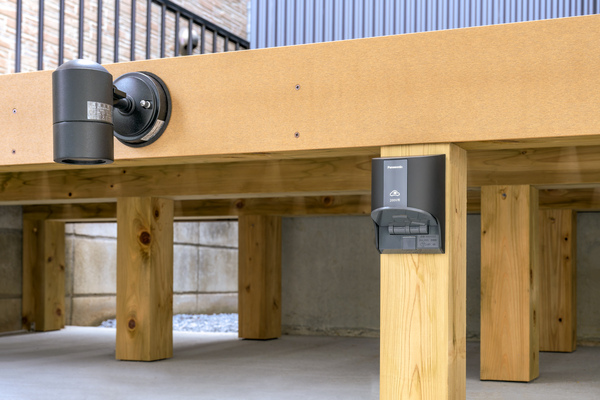 駐車スペースを照らす、デッキ側面に取り付けられたスポットライトとPHEVコンセント