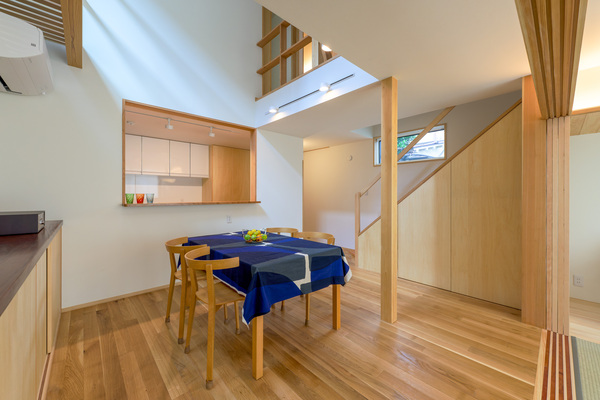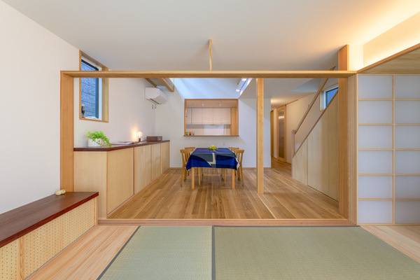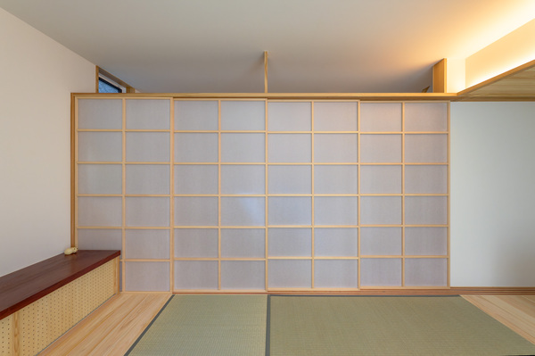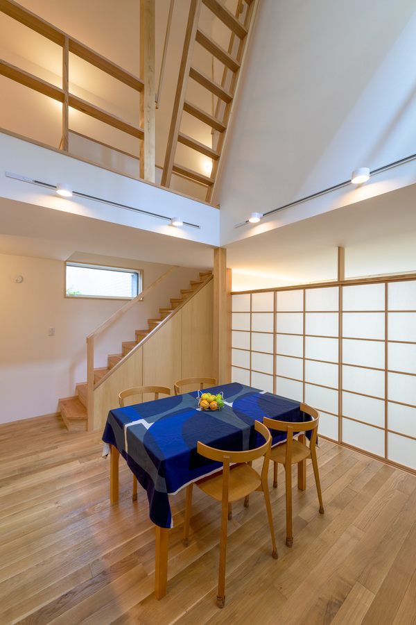 ダイニング側からも馴染む、大きな格子の障子とやわらかい光の間接照明
