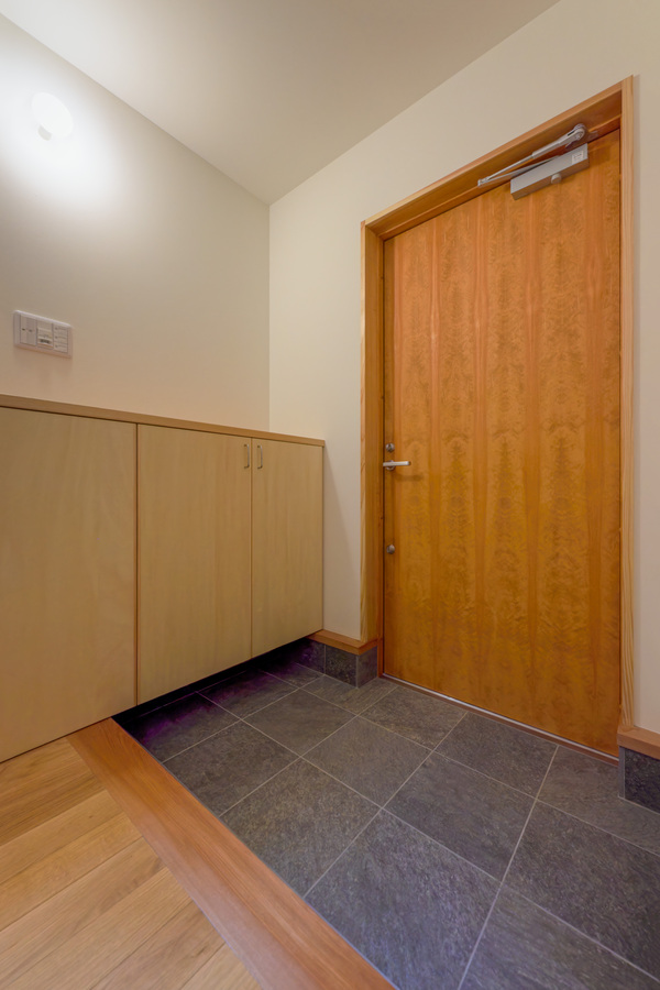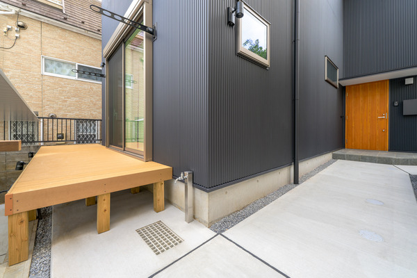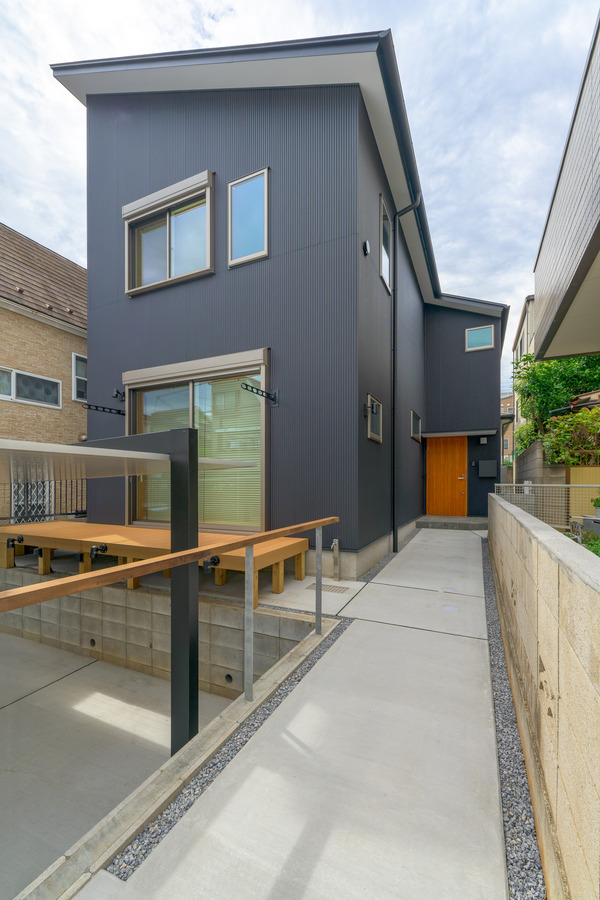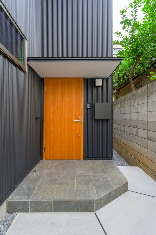 道路面から玄関ポーチまで続く、階段と緩やかなスロープ(高低差約1.5m)